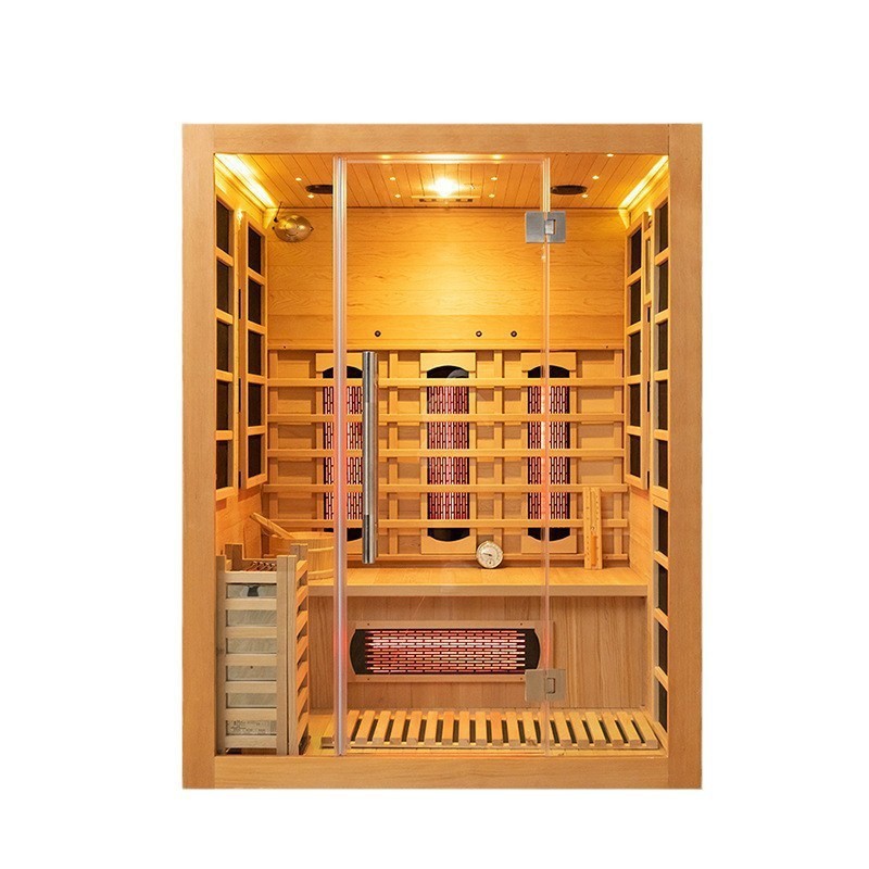 De houten infrarood- en stoomsauna voor 1-3 personen zit boordevol geavanceerde functies om uw wellnessreis te verbeteren: infraroodverwarmers en ver - infrarood grafeen verwarmingsplaten (zorgen voor een gelijkmatige, efficiënte verwarming voor diep, ontspannend zweten); Zuurstofionisator (zuivert de lucht in de sauna, waardoor een frisse en verkwikkende sfeer ontstaat); Leeslamp en luidspreker (hiermee kunt u muziek lezen of luisteren terwijl u geniet van uw saunasessie); Configuratiescherm (maakt eenvoudige aanpassing van temperatuur, tijd en andere instellingen mogelijk voor een persoonlijke ervaring); Saunakachel en lichtgolfbuis (werken samen om stoom en infraroodwarmte te genereren, geschikt voor liefhebbers van stoom- en ver-infraroodsauna's).