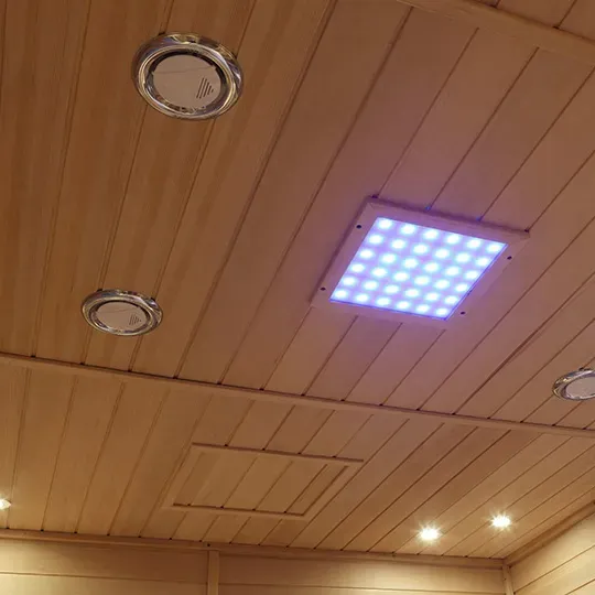 3. Verwarmings- en verlichtingservaring: Gelijkmatig verdeelde ver-infraroodverwarmingspanelen leveren zachte, doordringende warmte; sfeerverlichting boven + zijkant (in warme tinten) bevorderen de ontspanning en voorkomen benauwdheid of benauwdheid