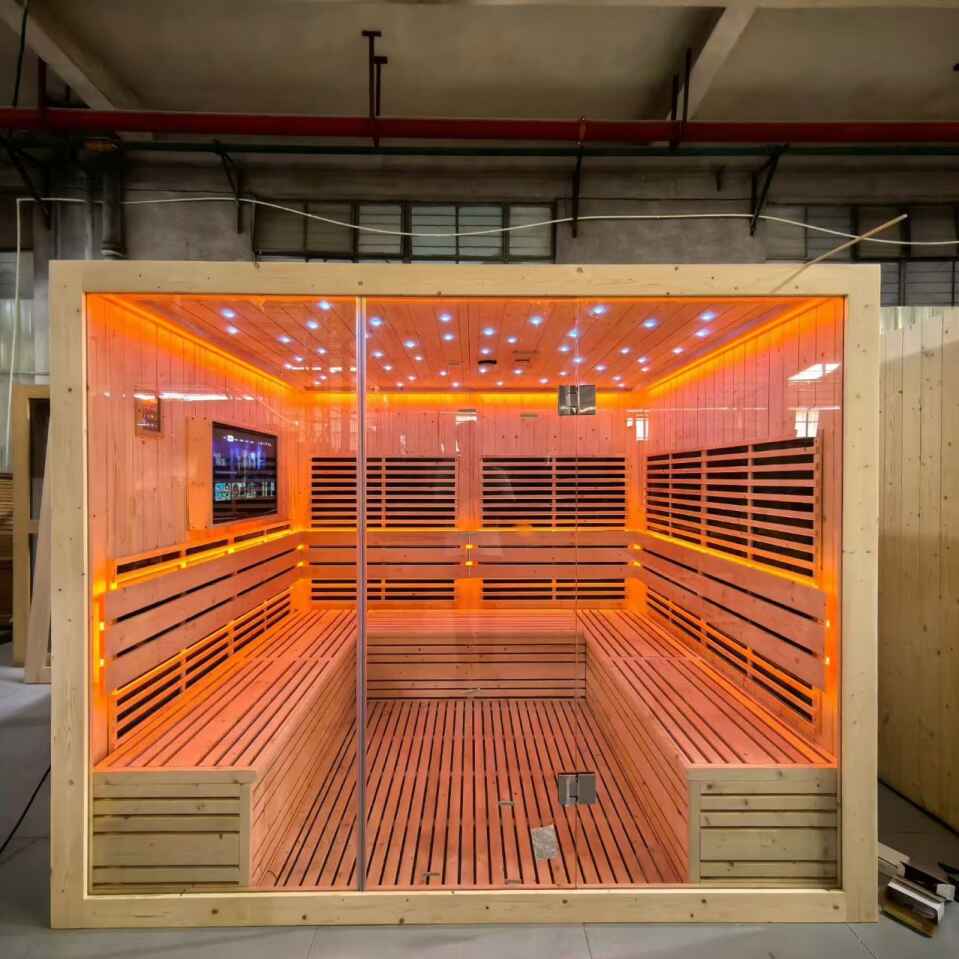 Investeer in een saunaruimte die groepswellness opnieuw definieert. Onze 5-10-persoons saunahout-ver-infraroodsauna met lcd-tv is meer dan een product: het is een knooppunt voor ontspanning, gezondheid en saamhorigheid. Neem vandaag nog contact met ons op om de aanpassingsmogelijkheden te verkennen en deze premium wellness-oplossing naar uw ruimte te brengen.