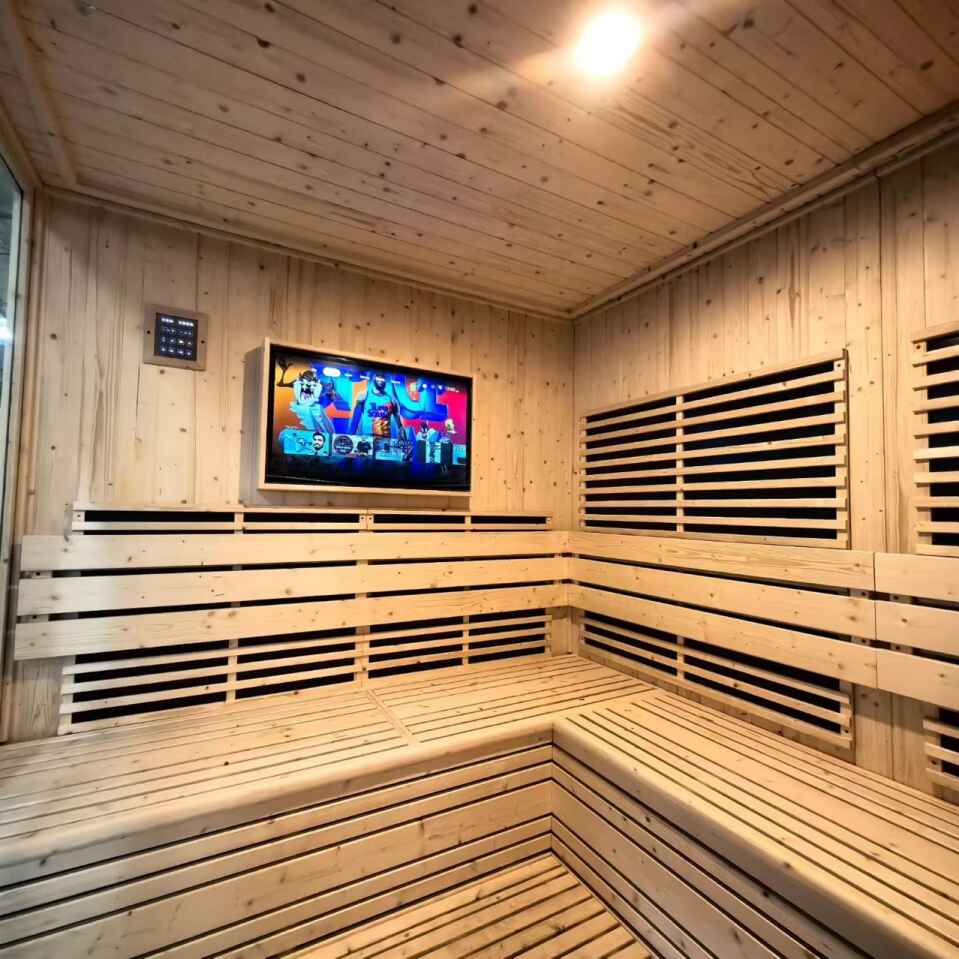 De ingebouwde LCD TV (zichtbaar op de afbeelding) transformeert de sauna-ervaring: