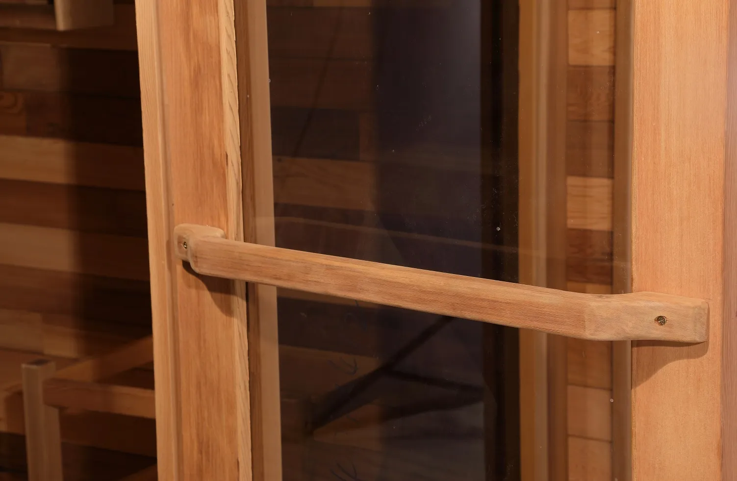 Gemaakt van hoogwaardig natuurlijk hemlockhout, met delicate en warme nerven en een subtiele natuurlijke houtgeur die comfortabel aanvoelt. Het materiaal ondergaat een professionele anticorrosiebehandeling en biedt een uniforme dichtheid en weerstand tegen vervorming en scheuren. Of het nu wordt blootgesteld aan direct zonlicht op het terras of aan vochtige omstandigheden op de binnenplaats, het behoudt een stabiele textuur voor langdurig gebruik, waarbij natuurlijke esthetiek wordt gecombineerd met praktische duurzaamheid om een serene, op het bos geïnspireerde sfeer te creëren voor uw buitensaunasessies.